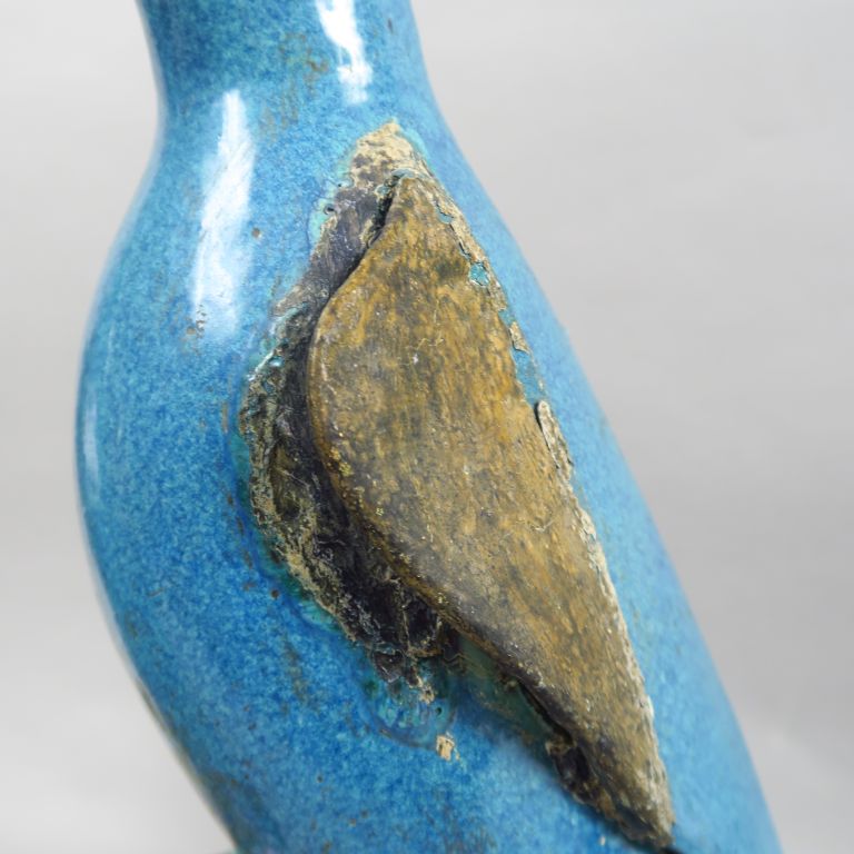 Couple de perruches en céramique émaillée bleu et arlequin. Chine, XVIIIème siècle (Accident) H. 34,5 cm