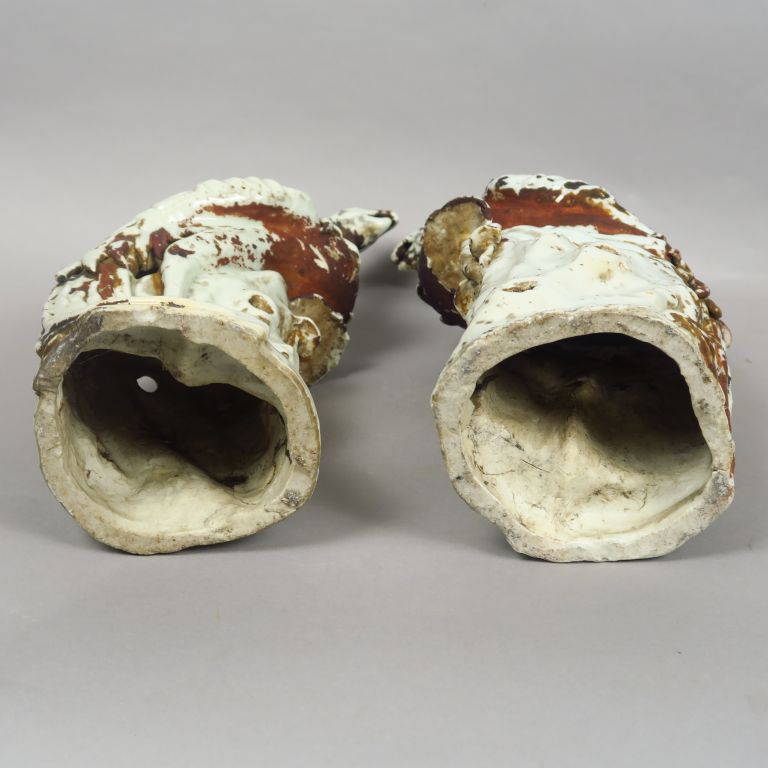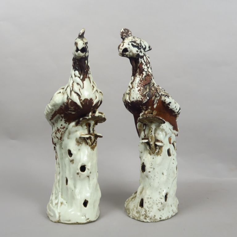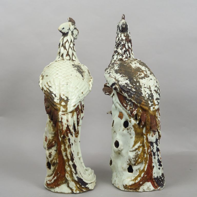 Couple d’oiseaux fohang en porcelaine blanche partiellement laquée. Chine, XIXème siècle. H. 35,5 cm et 35 cm