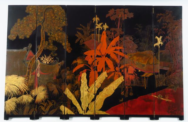 Dans le goût de Pham Hâu. Paravent à six feuilles, à décor laqué corail et or sur fond noir de bananiers, bambous et cocotiers près d'une maison lacustre. Vietnam, Xxème siècle. H. 106 cm Larg. des feuilles : 27 cm
