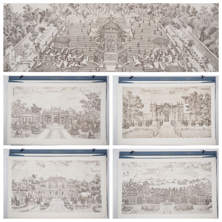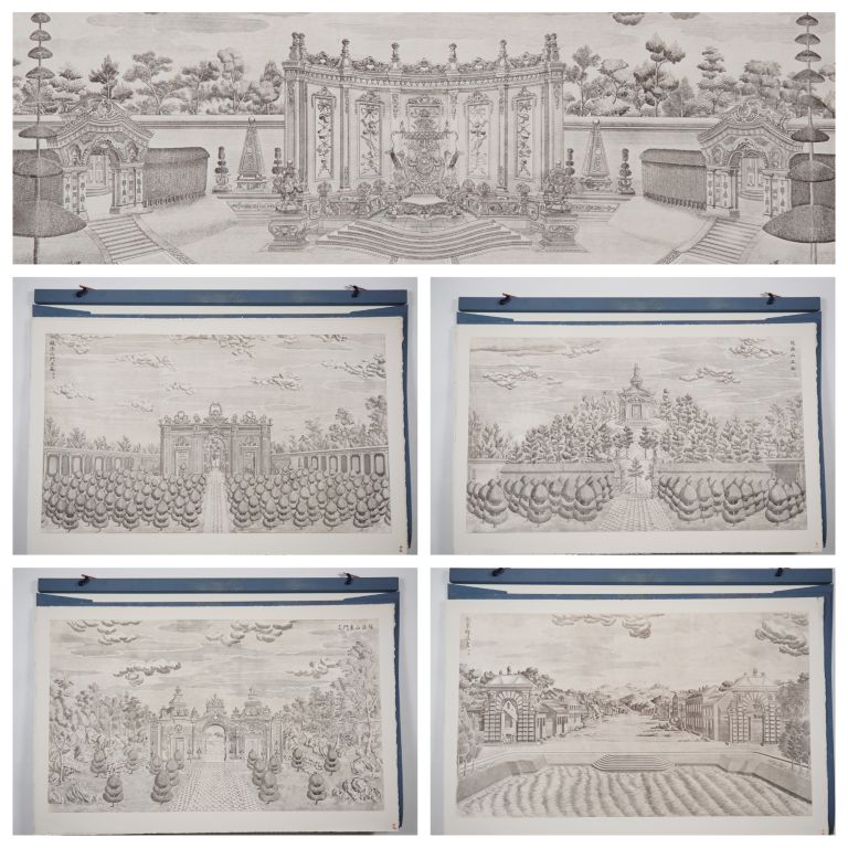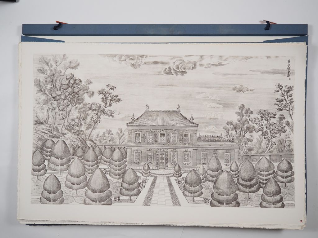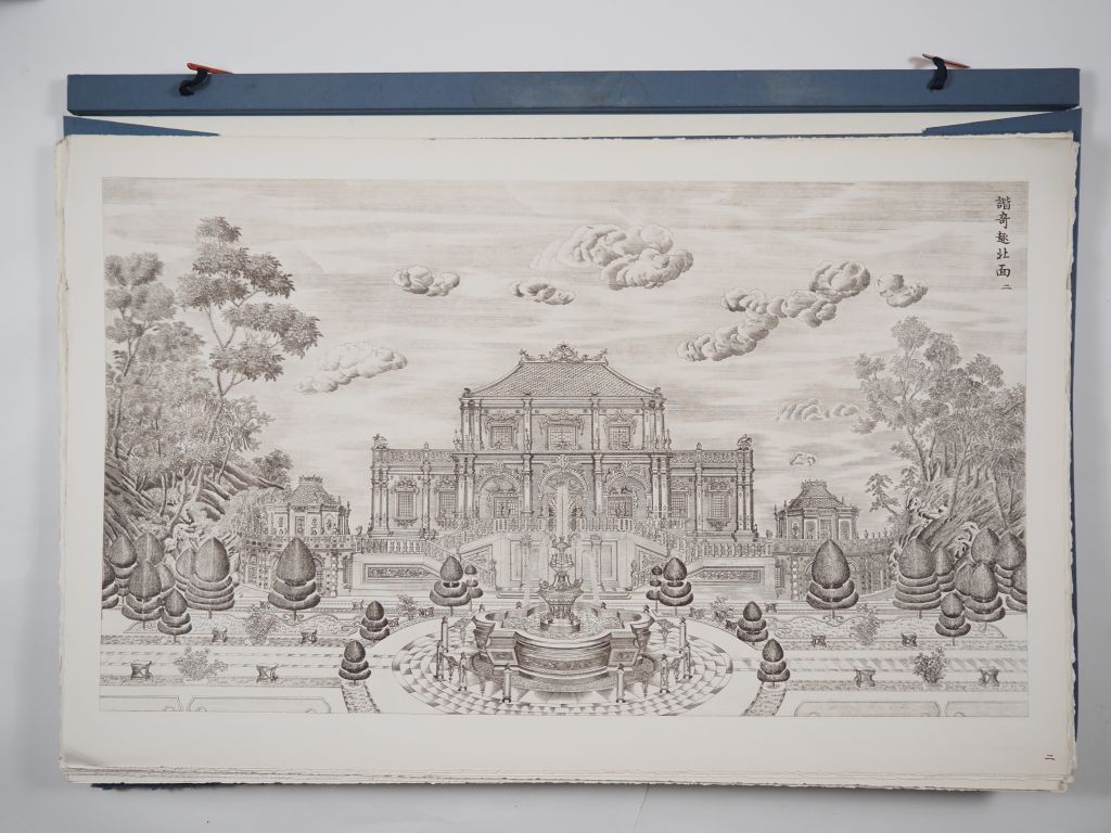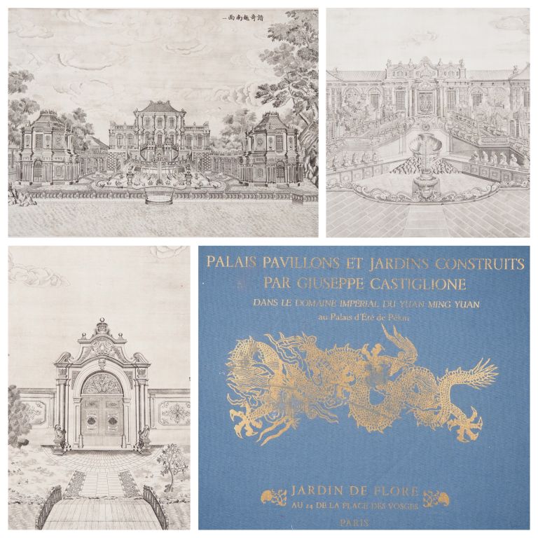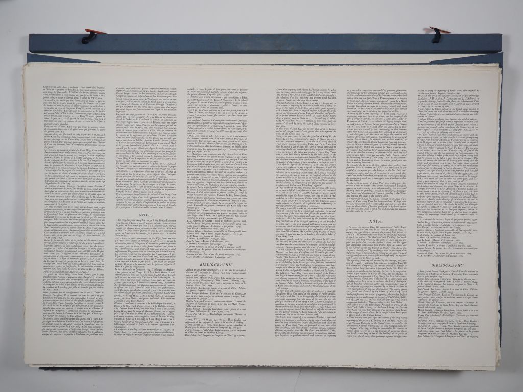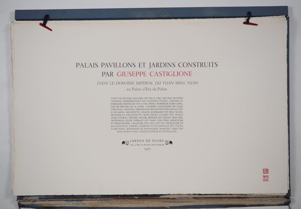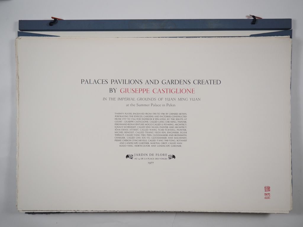 D'après Giuseppe CASTIGLIONE (1688-1766) « Palais Pavillons et jardins construits par Giuseppe Castiglione » dans le domaine impérial du Yuan Ming Yuan au Palais d’été de Pékin, comprenant vingt planches gravées à l’eau forte, par des artistes chinois, reprenant les compositions inventées par Giuseppe Castiglione entre 1783 et 1786. Edition jardin de Flore au 24 de la place des vosges, 1977. in-plano, 3 pp. de texte et 20 planches Dim. planches. 95 x 60 cm