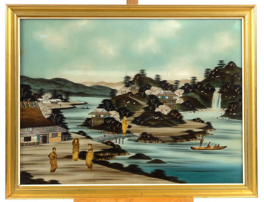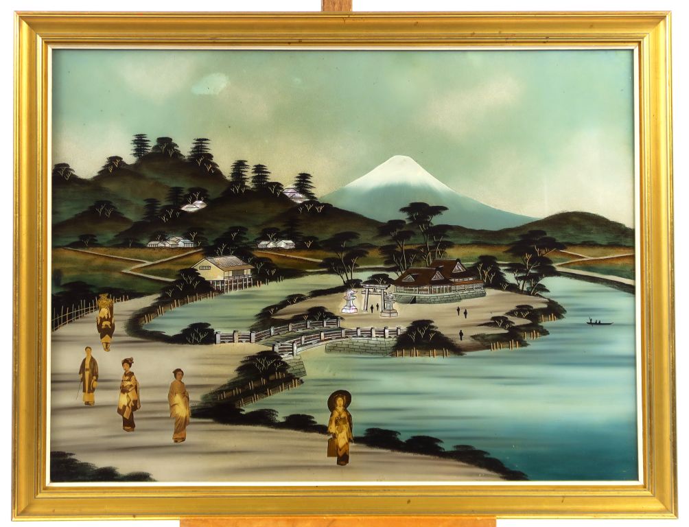Deux fixés sous verre représentant des scènes animées de personnages (en photographie) sur une d'elles on aperçoit le Mont Fuji. Japon, vers 1900. Dim. 44 x 60 cm.