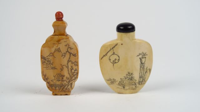 Deux flacons tabatières en ivoire, décor incisé et rehaussé d'encre de personnages sur des terrasses arborées, paysages montagneux et objets mobiliers. Chine, vers 1940. H. 4,8 cm et 5,6 cm Vente aux enchères conforme aux dernières instructions (17/11/2017) du Ministère transmises par le Conseil des Ventes.