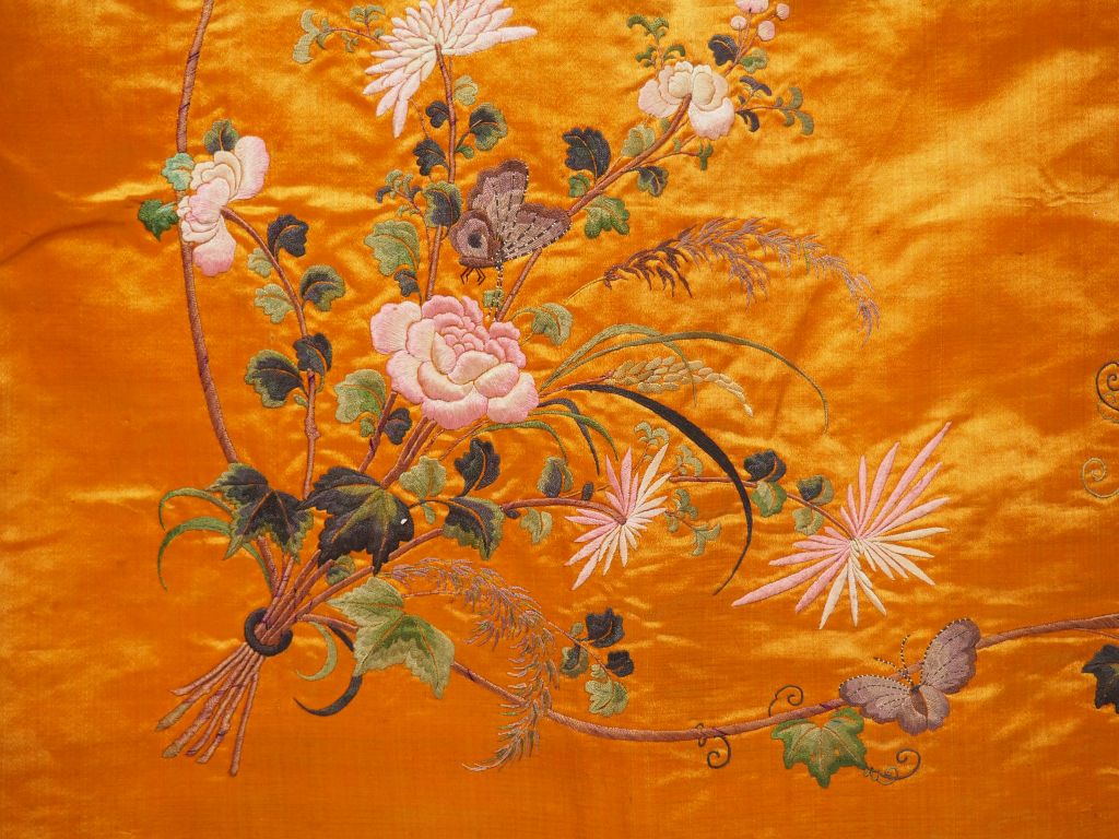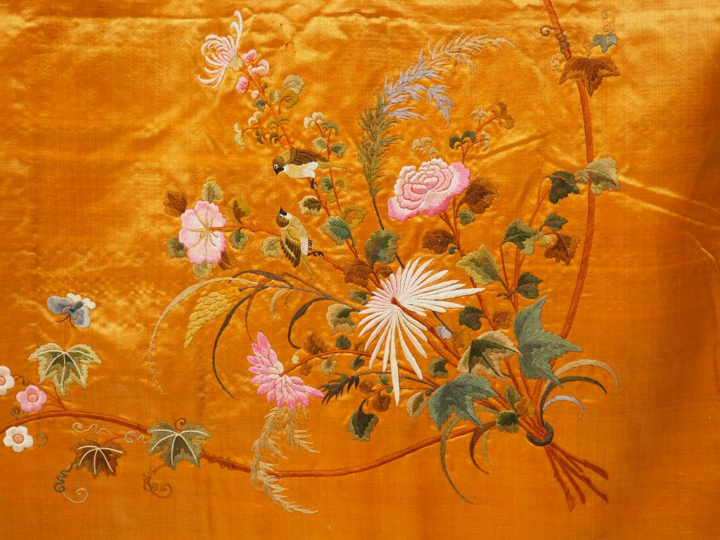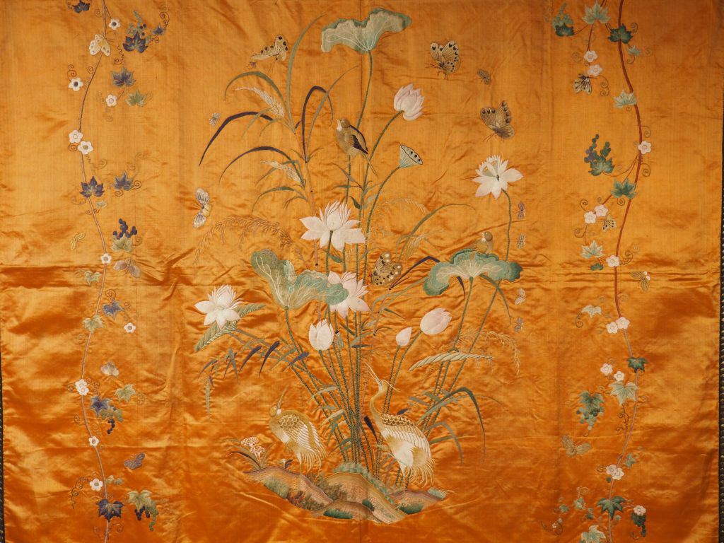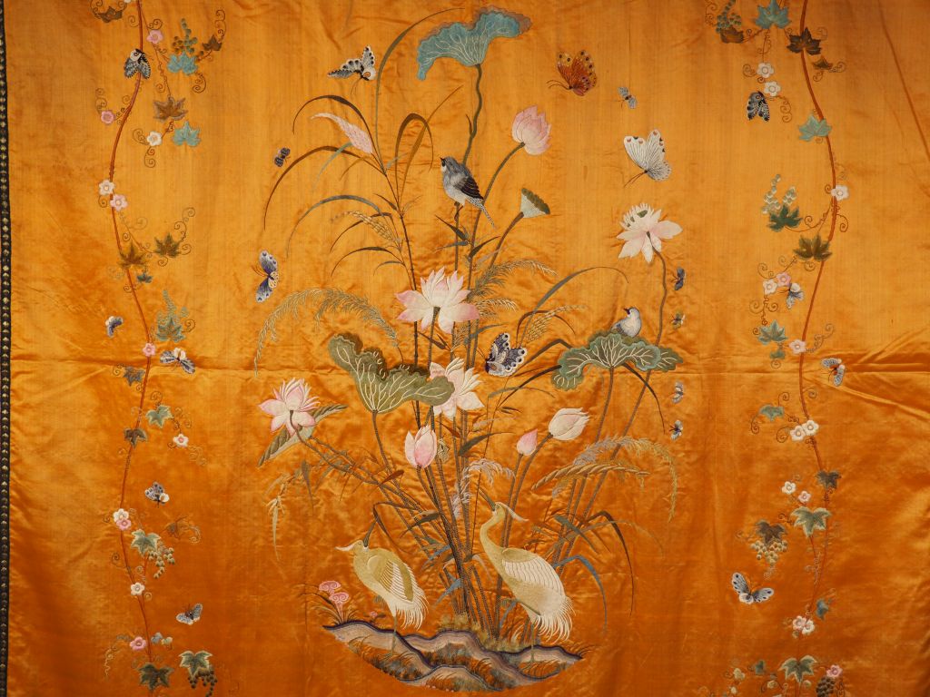 Deux grands panneaux en soie et lin brodé, à décor d'échassiers, de grues, d'oiseaux et de papillons parmi des lotus. Bordures ornées de pivoires. Indochine ou Vietnam, vers 1920. 210 x 136 cm