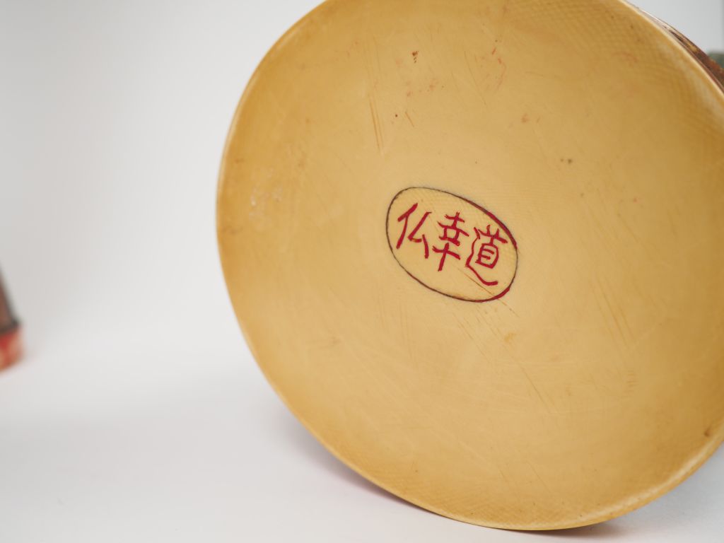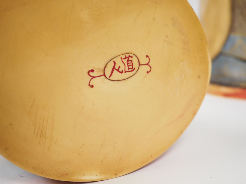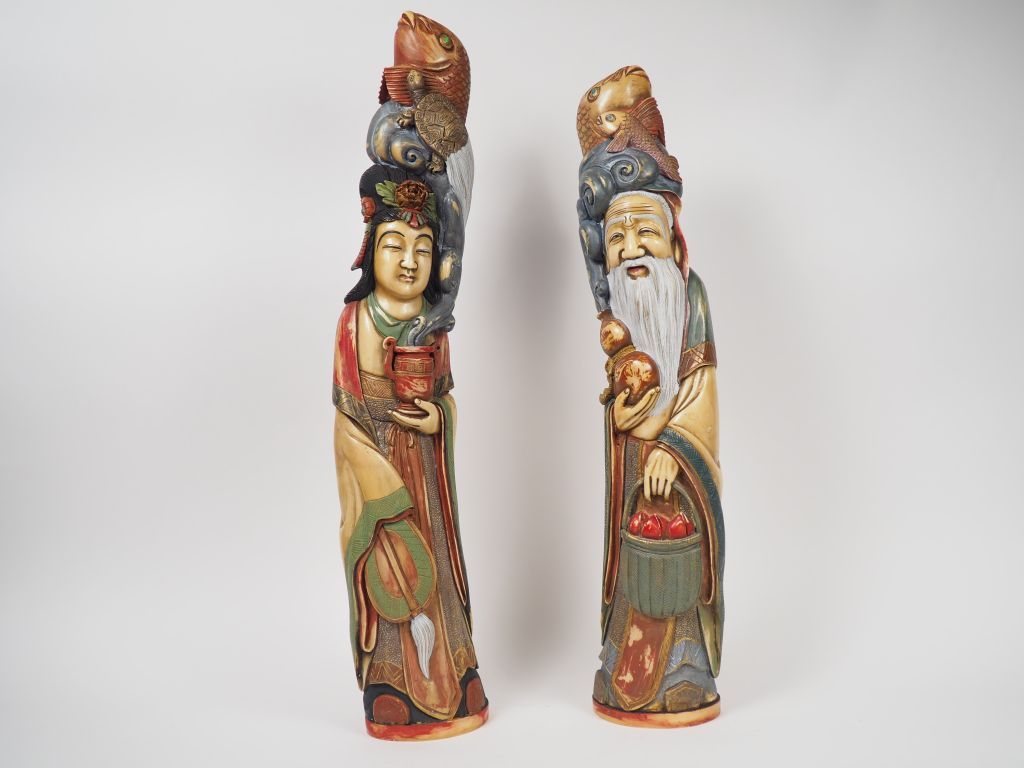 Deux importants okimonos en ivoire polychrome de patine légèrement ambrée représentant deux divinités du bonheur accompagnées de carpe. Japon, vers 1920, période Taisho. H. 65 cm et H. 70 cm Poids : 13900 g Nom scientifique de l’ivoire : ivoire d’éléphant Elephantidae spp (I/A, pré-convention), spécimen antérieur au 1er juin 1947 et conforme à la réglementation CE 338/97 du 09/12/1996, art. 2-W mc. Pour une sortie de L’UE, un CITES de ré-export sera nécessaire, celui-ci étant à la charge de l’acquéreur.