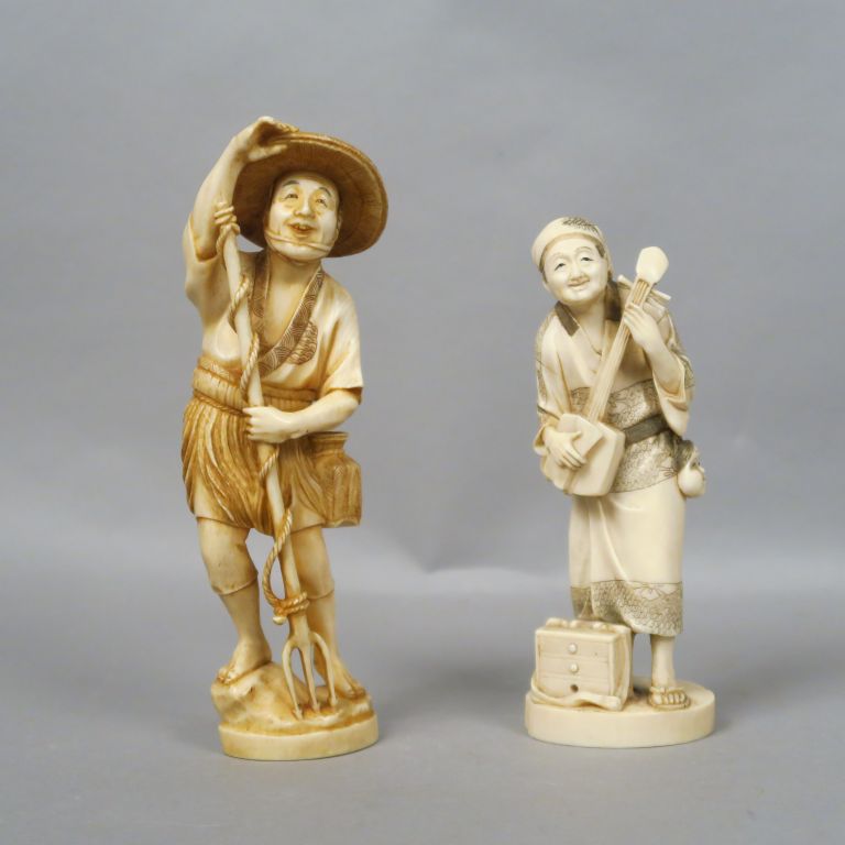 Deux okimonos en ivoire, l’un représentant un pêcheur avec harpon, l’autre, un joueur de shamisen. L’un, signé dans un cachet rouge. Japon, vers 1920. H. 18 cm et 16 cm Poids. 251 gr et 221 gr Nom scientifique de l’ivoire : ivoire d’éléphant Elephantidae spp (I/A, pré-convention), spécimen antérieur au 1er juin 1947 et conforme à la réglementation CE 338/97 du 09/12/1996, art. 2-W mc. Pour une sortie de L’UE, un CITES de ré-export sera nécessaire, celui-ci étant à la charge de l’acquéreur.