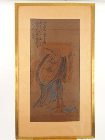 Deux peintures chinoises : l'une représentant Buddha (signature apocryphe Luo Pin) , l'autre représentant un pêcheur (signature apocryphe Shangguan Zhou). 74,5 x 35,5 cm