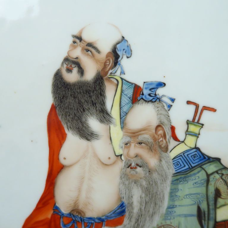 Deux plaques en porcelaine, d’une suite de quatre, chacune à décor polychrome de deux des Baxian, les huit Immortel taoïstes, parmi des nuées. Dans des encadrements en bois. Chine, début XXe siècle. Dim. plaque : 79,5 x 18,3 cm
