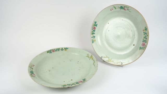 Deux plats creux en porcelaine, à décor de branchage de fleurs au niveau de l'aile. Compagnie des Indes, fin XVIII ème - début XIX ème siècle. Diam. 37 et 40 cm