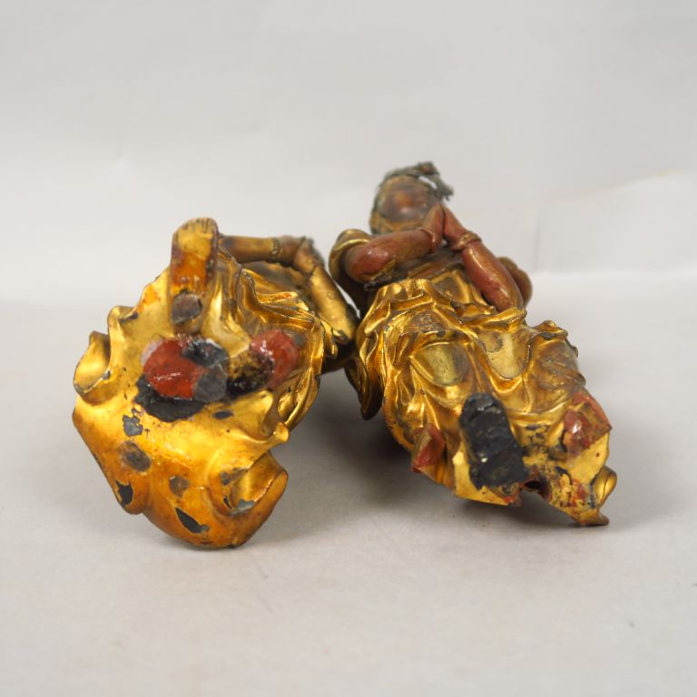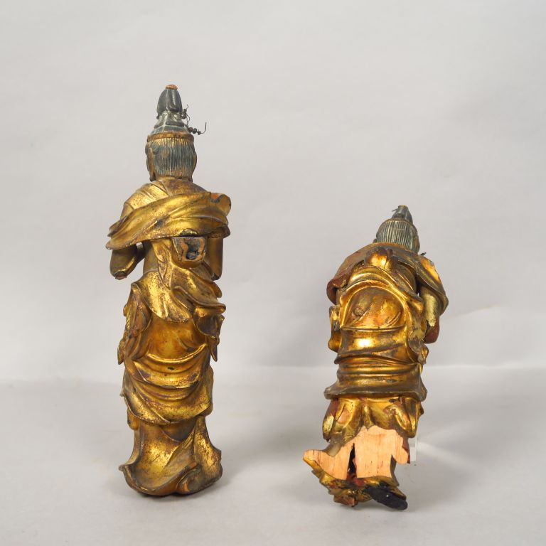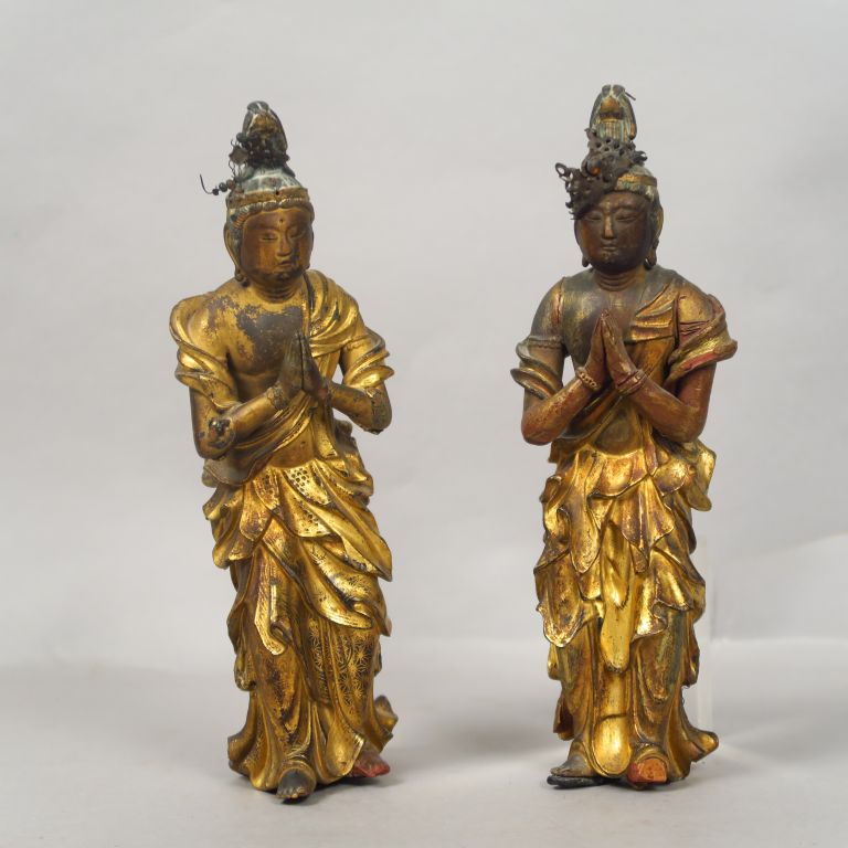Deux sujets en bois laqué et doré, représentant des adorants, debout, les mains jointes, vêtus de la robe monastique. Japon, fin de la période Edo, fin XVIIIème - début XIXème siècle. H. 21,5 cm (Manques)