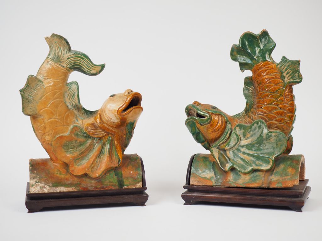 Deux tuiles faitières formant pendant en céramique émaillée sancai représentant des poissons émergeant des flots. Chine, dans le style des Ming, XIXème siècle. H. 31 cm (quelques petits manques, restaurations anciennes)