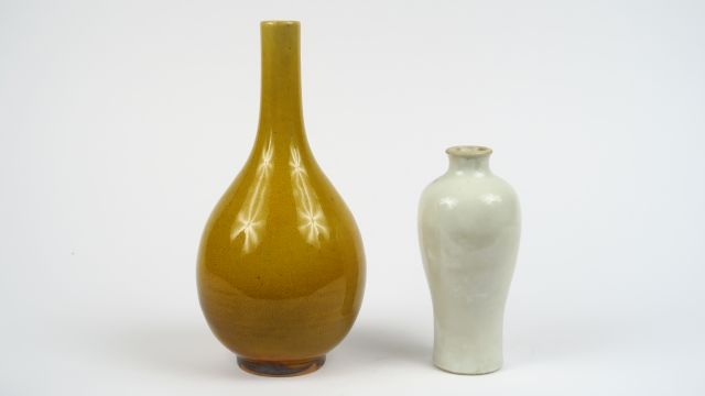 Deux vases en porcelaine émaillée l'un jaune craquelé de forme bouteille, l'autre blanc de forme meiping. Chine, dynastie Qing, XIX ème siècle. H. 24 et 18 cm