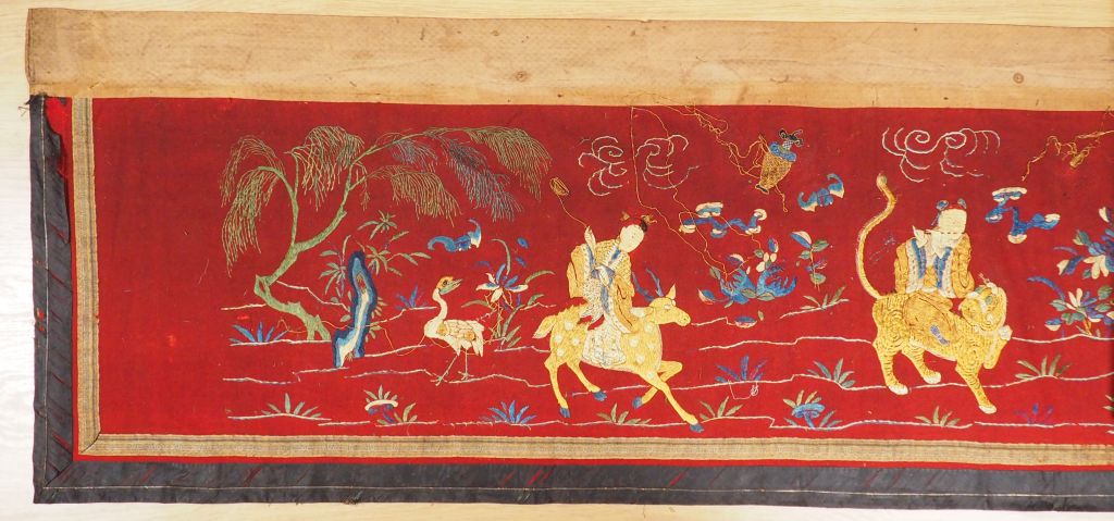Devant d'autel en lin brodé et fils d'or, à décor des huit immortels. Chine, deuxième moitié du XIXème siècle. 61,5 x 510 cm