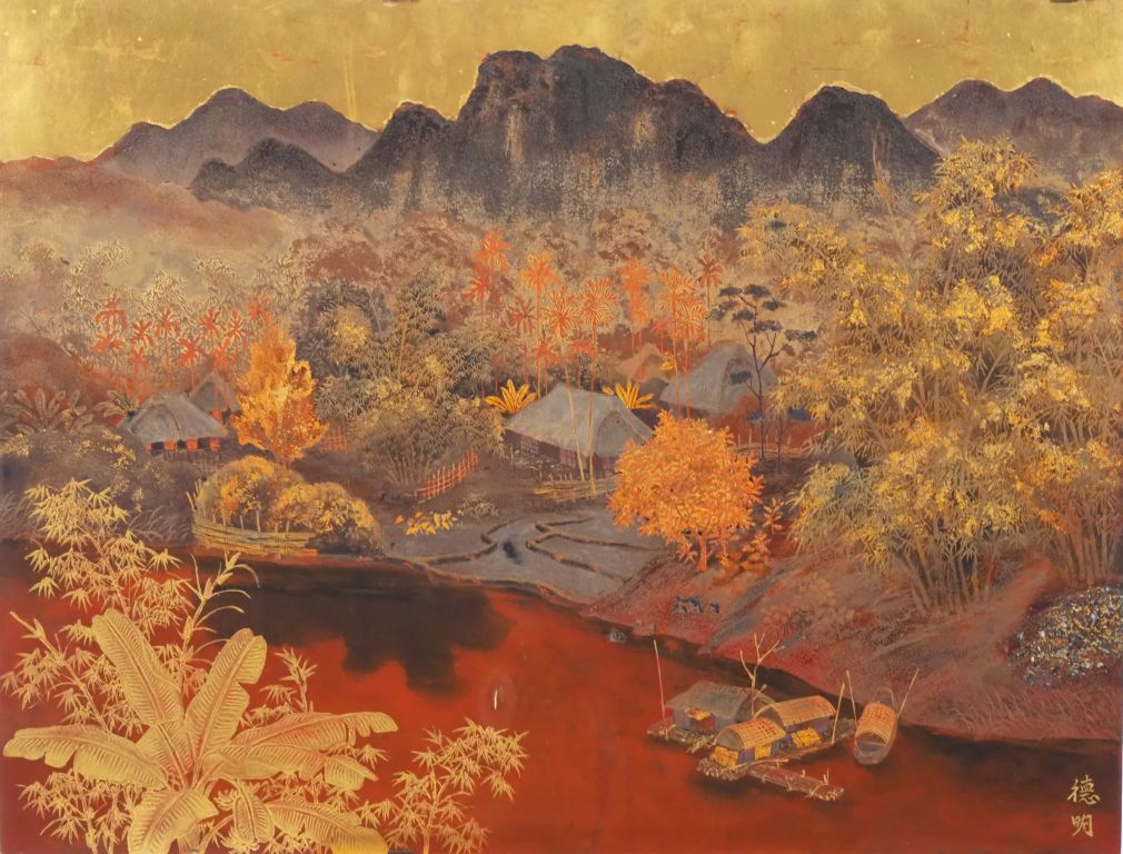 DUC MINH (mort en 1964) Panneau en laque à décor en rouge, brun, or d'une rivière s'écoulant le long d'un village de campagne entouré de bambou, cocotiers, bananiers et flamboyants. En perspective, des pics montagneux entourés de nuages. Rayures. Signé en bas à droite en deux caractères Duc Minh. Dim. 50 x 65 cm N.B: Duc Minh était artiste actif à Hanoi entre 1930 et 1945. (petit manque de laque, rayure)