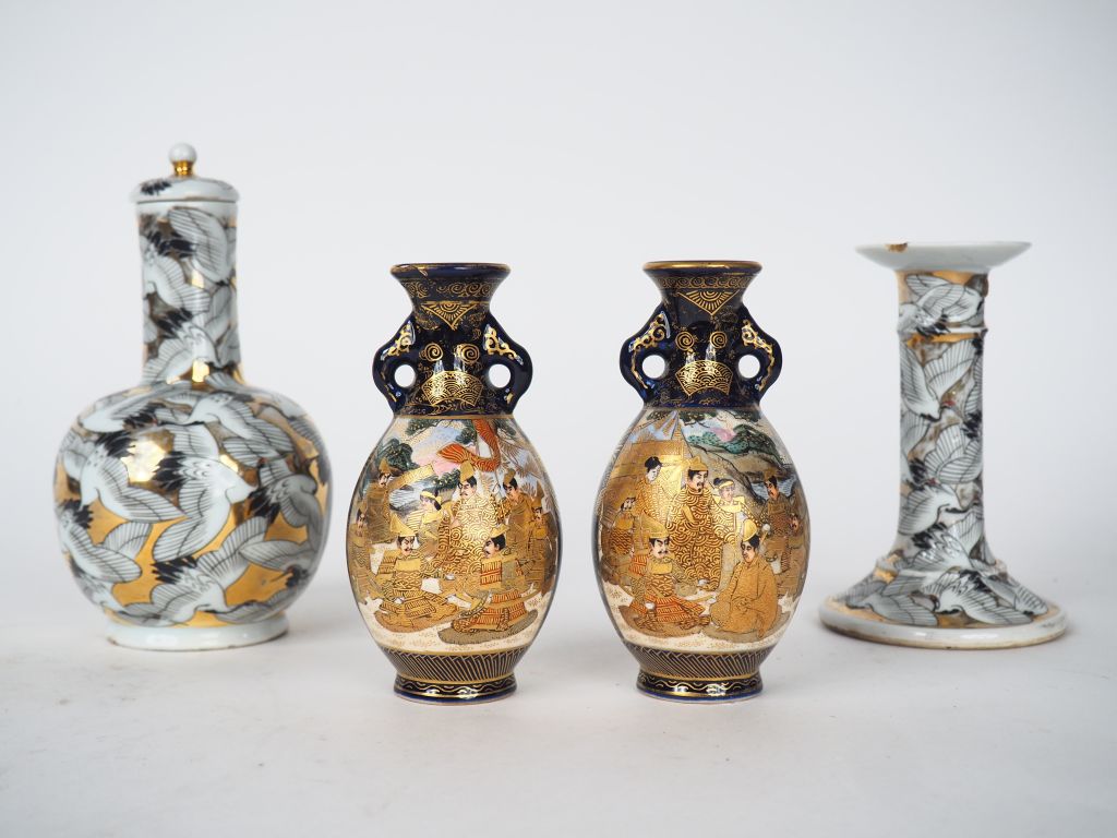 E,nsemble comprenant : - une paire de vases en Satsuma à décor de personnages - un vase couvert en Satsuma à décor d'échassier. - un bougeoir (éclat)