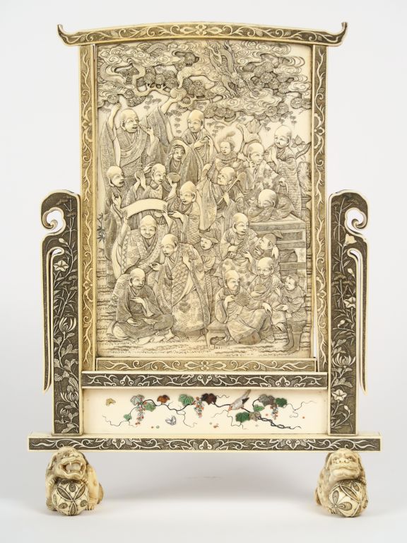 Ecran de lettré en ivoire à décor finement sculpté sur une des faces de dix huit Harrats, l'autre face décor laqué de motifs végétaux et d'un arbre d'or sur lequel est perché un oiseau , incrustations en nacre, corail Hira Takamakie. , le présentoir repose sur deux chichis tenant le joyau sacré, finement sculpté de bambous et de fleurs , très finement décoré parmi des arbustes en fleurs. Japon période Meiji. Dim. 28,2 x 20,2 cm Poids : 644 g Nom scientifique de l’ivoire : ivoire d’éléphant Elephantidae spp (I/A, pré-convention), spécimen antérieur au 1er juin 1947 et conforme à la réglementation CE 338/97 du 09/12/1996, art. 2-W mc. Pour une sortie de L’UE, un CITES de ré-export sera nécessaire, celui-ci étant à la charge de l’acquéreur.