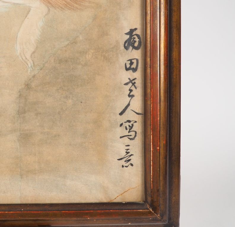 Encre et couleurs sur papier représentant un chien Shitsu sous un pivoinier en fleurs Chine XIXème Dim. 85 x 52 cm