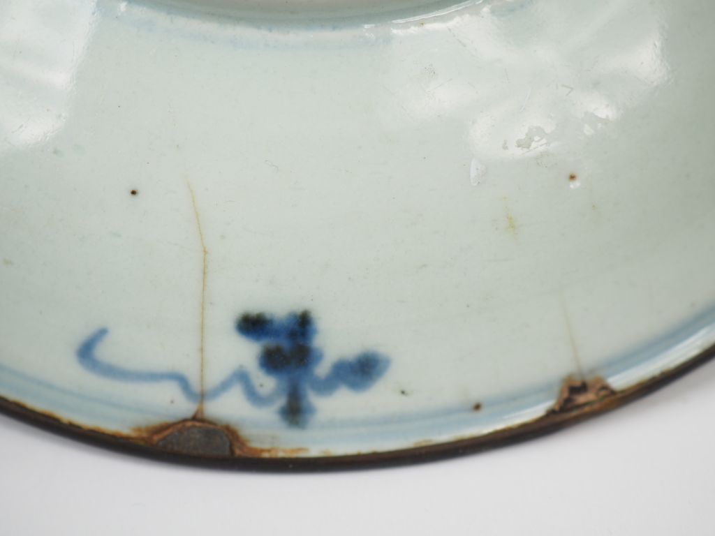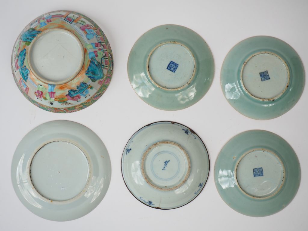 Ensemble comprenant : - une coupe en porcelaine de Canton Diam. 22 cm (fel) - une assiette en porcelaine de Canton Diam. 21 cm - trois petites assiettes en porcelaine de la famille rose sur fond céladon à décor d'oiseaux, papillons et fleurs Diam. 18 cm - une coupe en porcelaine bleu blanc, à décor de fleurs et rochers. Faites pour le Vietnam. Diam. 19 cm