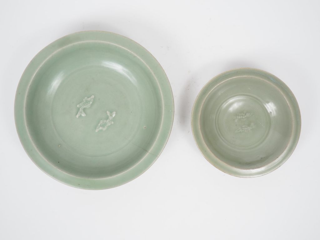 Ensemble comprenant : une grande et une petite coupes creuses en porcelaine et émail céladon, à décor de poissons sous couverte. Chine, période Ming. Export pour le Sud Est asiatique. Diam. 27,5 cm et 19,5 cm (l'un d'eux felé)