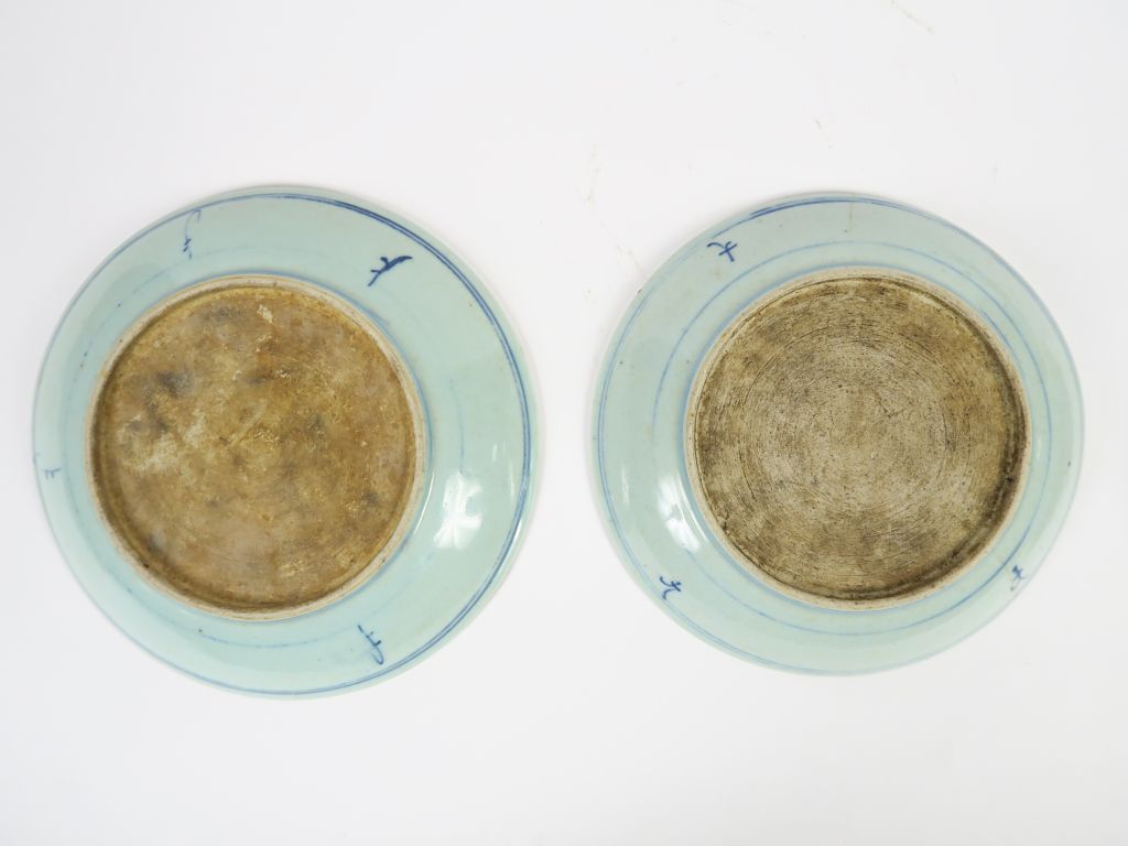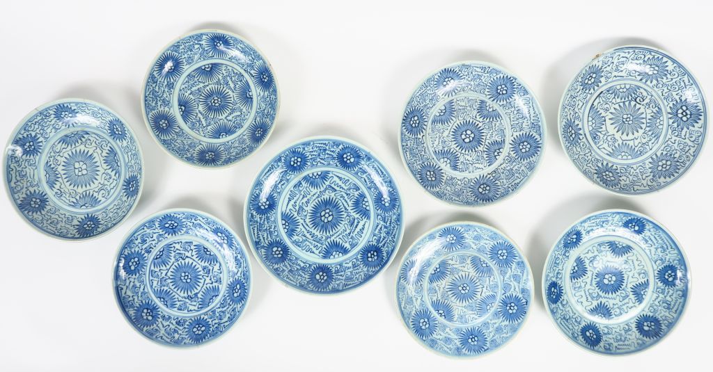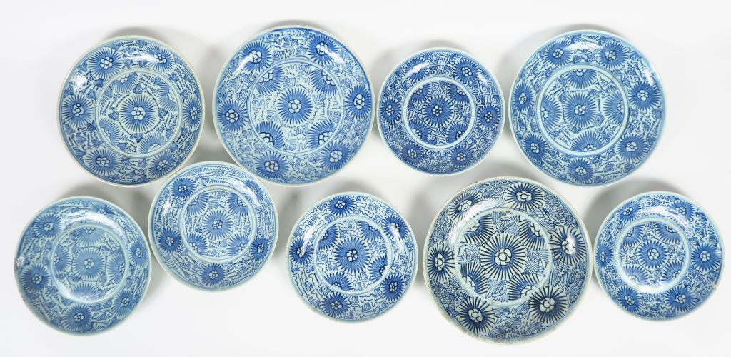 Ensemble de 17 coupes et assiettes creuses en porcelaine bleu blanc, à décor de fleurs et motifs stylisés. Chine, XIXème siècle. Diam. 21 à 27 cm (quelques éclats)