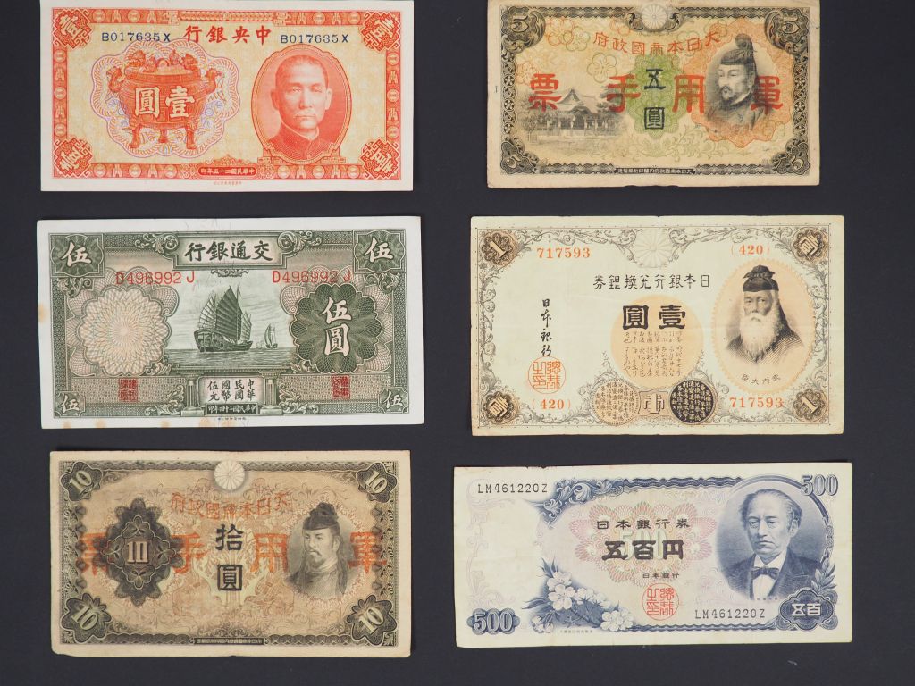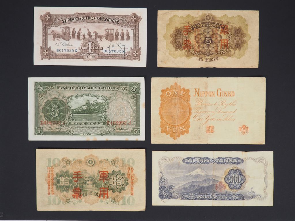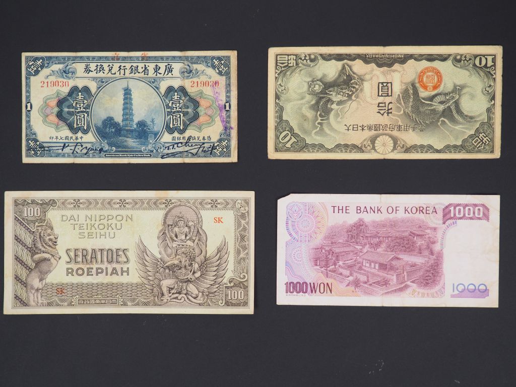 Ensemble de billets de différents pays asiatiques, dont la Chine (datés de la 24ème et 25ème de la période République), le Japon, la Corée et la Thaïlande.
