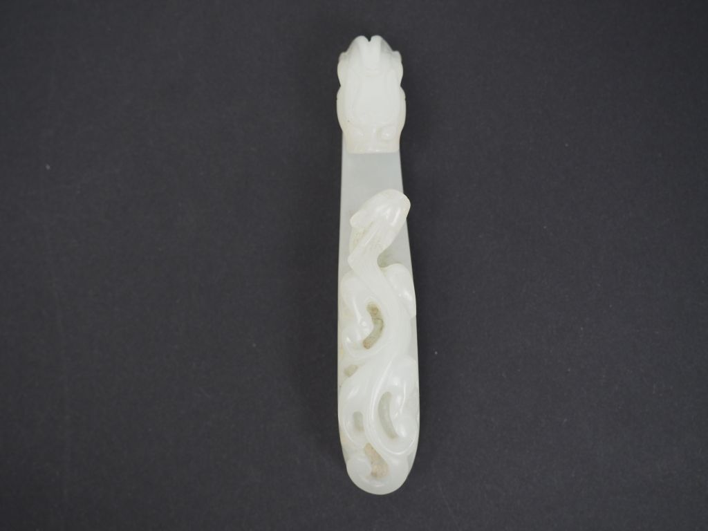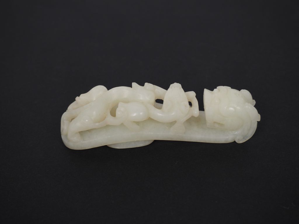 Ensemble de six fibules en jade blanc céladon décor de double dragon. Chine. Dim. 8 à 10 cm