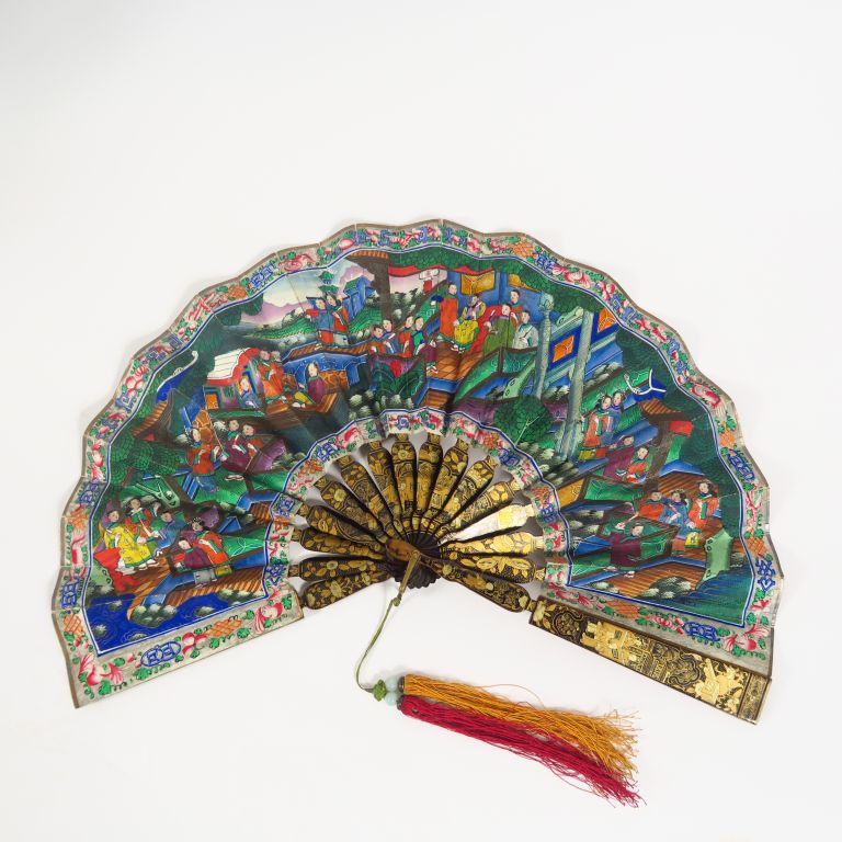 Eventail, à décor peint sur papier de scène de palais animée de personnages, d'oiseaux et de compositions florales. Les têtes en ivoires, les bruns laqués or et noir. Chine, travail de Canton. H. 19,5 cm Dans son coffret.