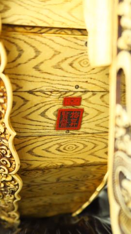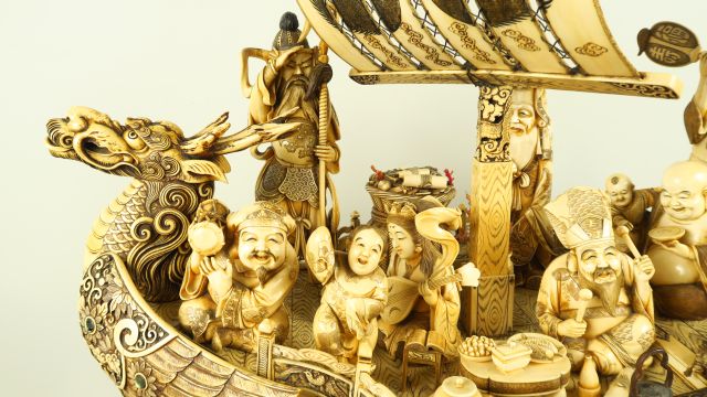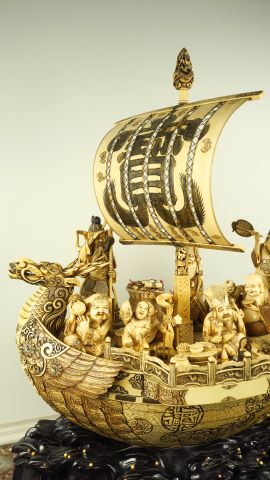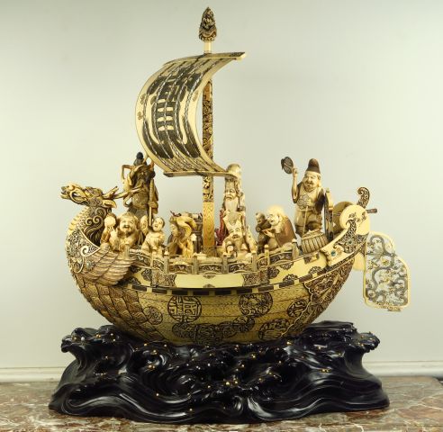 Exceptionnel groupe en ivoire représentant la jonque Takarabune à tête de dragon formant proue. Elle transporte à son bord les 7 dieux du bonheur accompagnés d'un serviteur. Elle repose sur un socle en bois sculpté figurant des vagues écumantes. H. sans le socle : 85 cm Vente aux enchères conforme aux dernières instructions (17/11/2017) du Ministère transmises par le Conseil des Ventes.