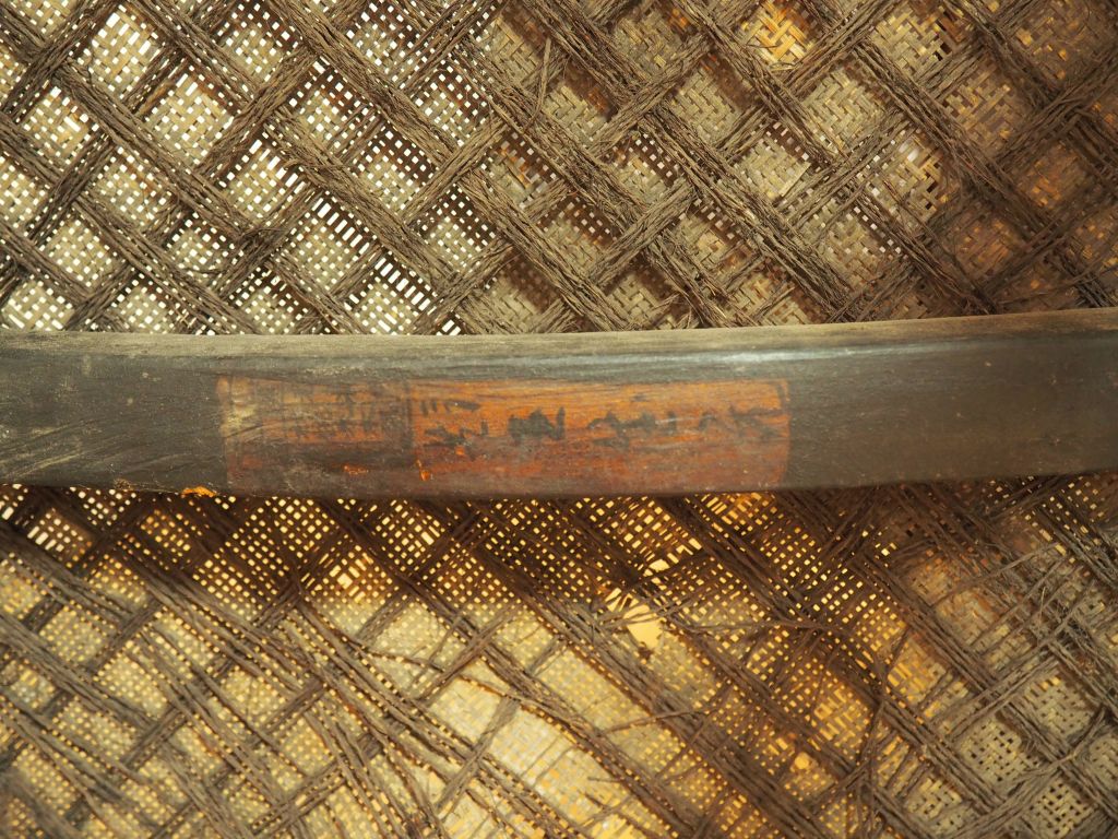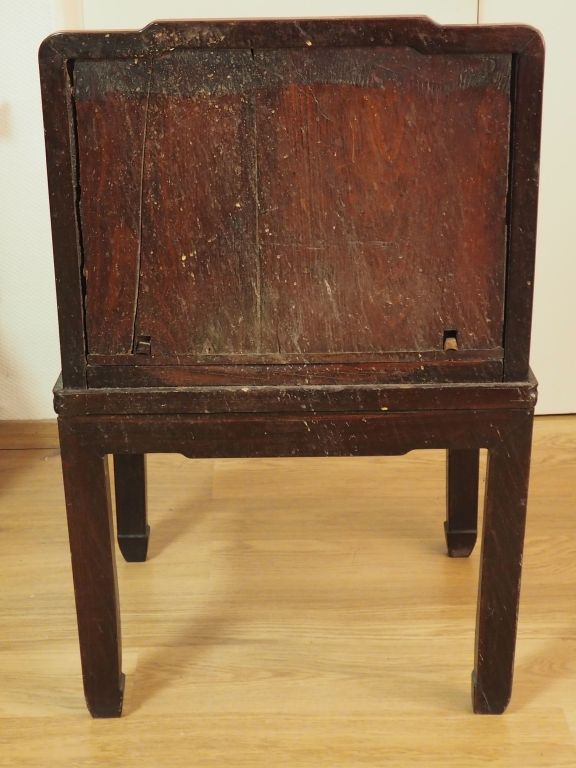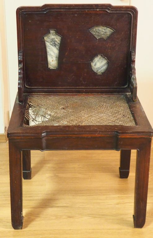 Fauteuil en bois dur à dossier orné de trois pierres de rêve. Les accoudoirs représentant des dragons stylisés. Marque d’atelier sous le fauteuil. Assise accidentée H. 95 cm