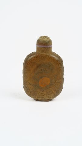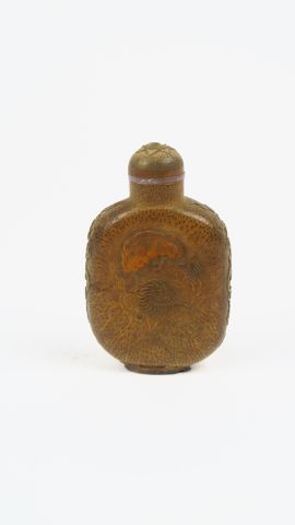 Flacon tabatière de forme balustre en bambou, décor d'un lion, chauve-souris, fruits et fleurs. Chine, XIX ème. H. 7,5 cm (Petit rodage au col)