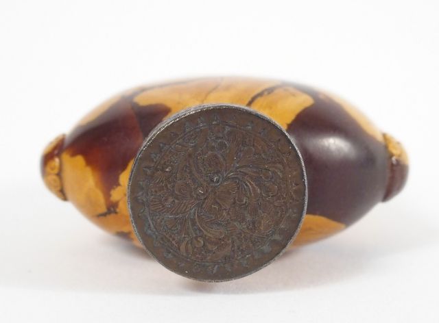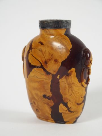 Flacon tabatière en écaille, orné de deux têtes de dragon, bouchon en argent. Chine XIXème. H. : 7,5 cm