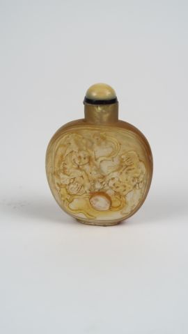 Flacon tabatière en nacre, décor d'une chauve-souris tenant un lingzhe face à un lion. Chine, vers 1900. H. 5,4 cm