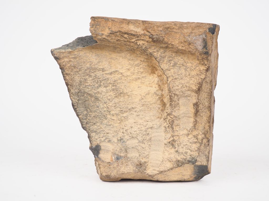 Gandhara, II-IIIe siècle Kushan, Fragment en grès beige d’une frise représentant un bouddha accoudé à un élément d’architecture. Dim. 19,5 x 20 cm