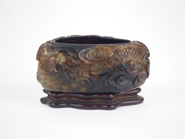 Godet de lettré en stéatite beige veiné de brun sculpté d'un dragon parmi des nuages Ruyi. Chine XVIIIème/XIXème. 4,5 x 10 cm