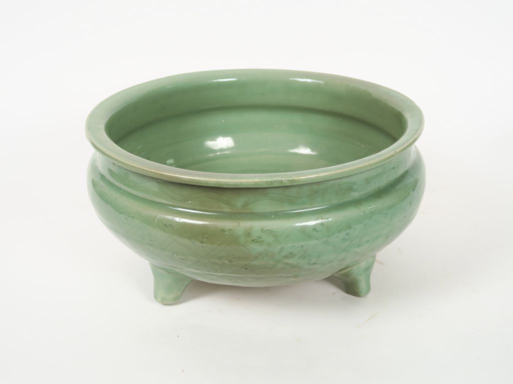 Grand-brûle parfum tripode en porcelaine et émail céladon, décor sous couverte de fleurs stylisées. Chine, XVème siècle. Diam. 32,5 cm (restaurations)