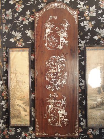 Grand panneau en bois de rose, à décor de vases de fleurs et d'insectes (petit manque). Deuxième moitié du XIXme. Indochine travail de Nandinh