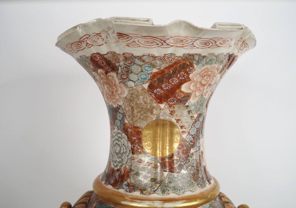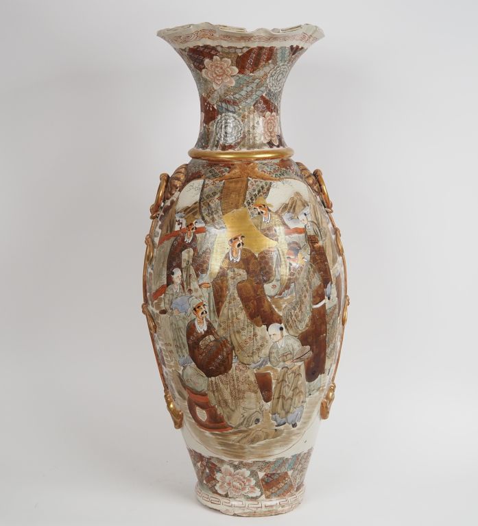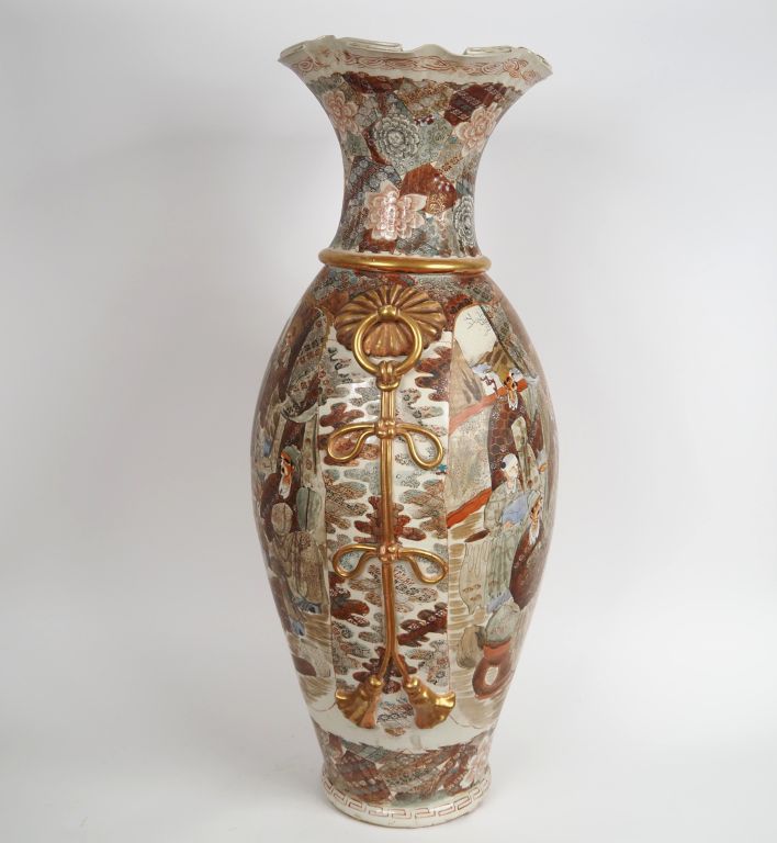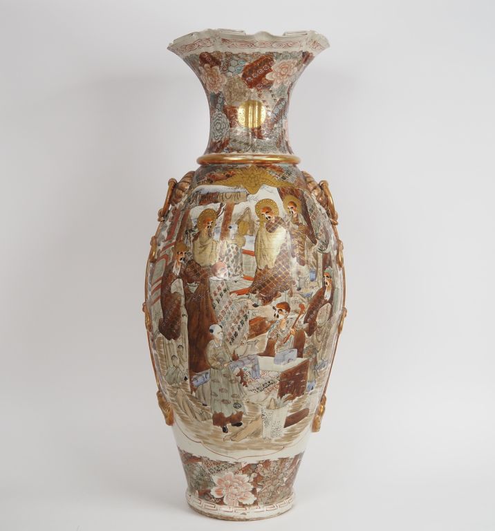 Grand vase à col festoné en porcelaine de Satsuma à décor de Daimyo et d'Arrhats, des motifs de passementerie complètent l'ornementation. H. 102 cm. (Accident au col).