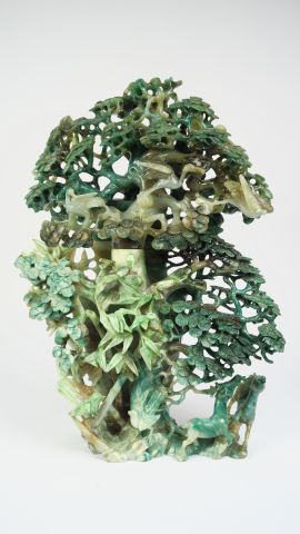 Grand vase couvert en serpentine, dite jade de renom, décor de grues parmi un pin de longévité. Chine, vers 1840. H. 44,5 cm (Petites égrenures)