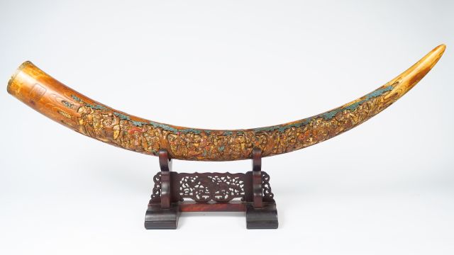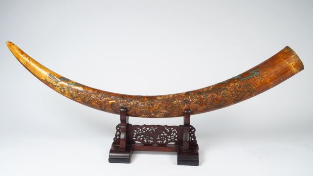 Grande défense en ivoire polychrome, finement sculptée de dragons parmi des flots et de personnages. Japon, vers 1920. Dim. 142 cm Poids. 17 kg Vente aux enchères conforme aux dernières instructions (17/11/2017) du Ministère transmises par le Conseil des Ventes.