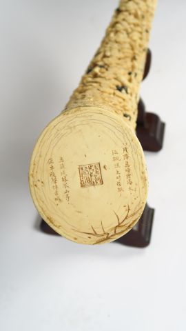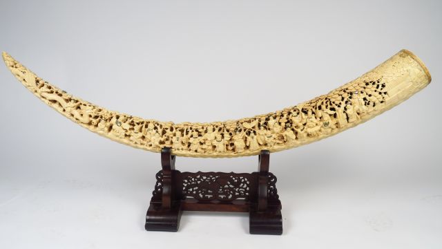 Grande défense sculptée, à décor du Banquet des Immortels dans une forêt de pins. Chine, vers 1940. Dim. 127 cm Poids : 11.4 kg Vente aux enchères conforme aux dernières instructions (17/11/2017) du Ministère transmises par le Conseil des Ventes.