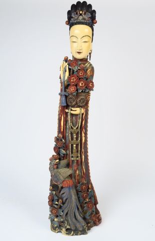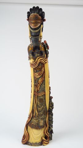 Grande sculpture en ivoire polychrome, représentant une jeune femme tenant un rosaire et un panier de pivoines, coiffe ornée de deux oiseaux fohang. Japon, vers 1920. H. 110 cm Poids. 27.9 kg Vente aux enchères conforme aux dernières instructions (17/11/2017) du Ministère transmises par le Conseil des Ventes.