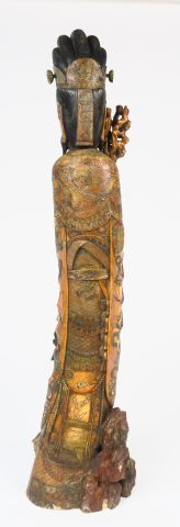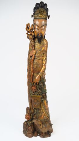 Grande statue en ivoire polychrome, représentant un dignitaire tenant un vase fleuri et un bâton noueux, un bouc à ses côtés. Japon, vers 1920-1930 H. 99.5 cm Poids. 16.3 kg Vente aux enchères conforme aux dernières instructions (17/11/2017) du Ministère transmises par le Conseil des Ventes.