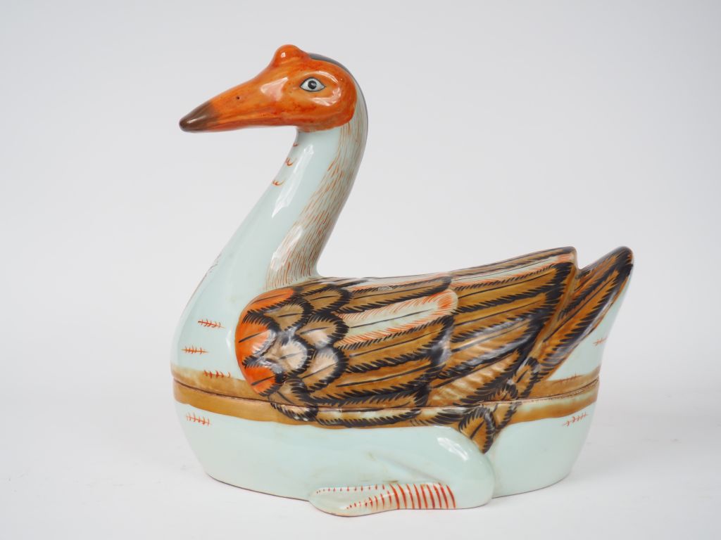 Grande terrine en porcelaine de Chine, compagnie des Indes, figurant un canard polychrome. Monogrammée sous la base. Dim : 35,5 x 38 x 27 cm.