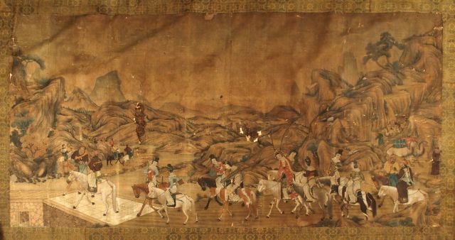 Grande toile peinte à décor polychrome d’une caravane de voyageurs à cheval et chameaux, s’apprêtant à traverser un pont dans un paysage de montagnes. Chine, fin XIXe siècle. Dim. de l'ensemble 146 x 270 cm (manques et accidents)