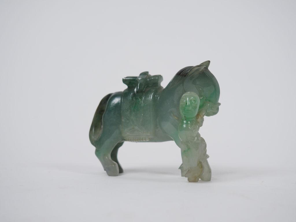 Groupe en jadéite représentant un enfant conduisant un cheval portant des manuscrits. Chine, vers 1900. 6 x 7 cm