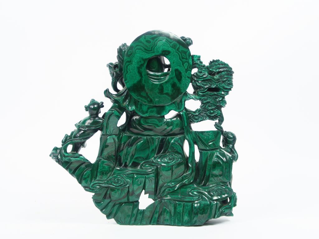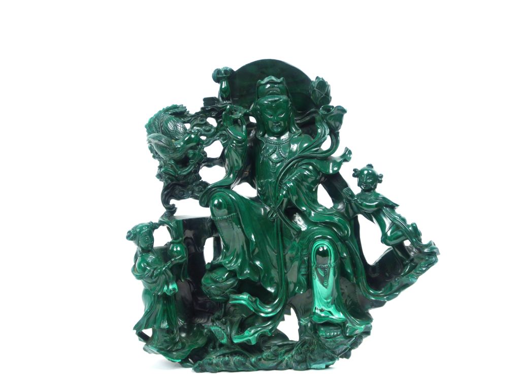 Groupe en malakite représentant la déesse Lagoini. Chine, XXème siècle. (accidents) H. 32 cm