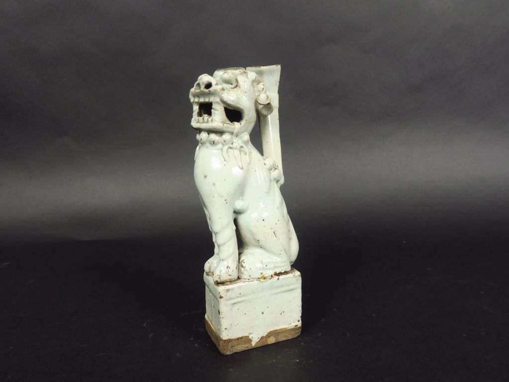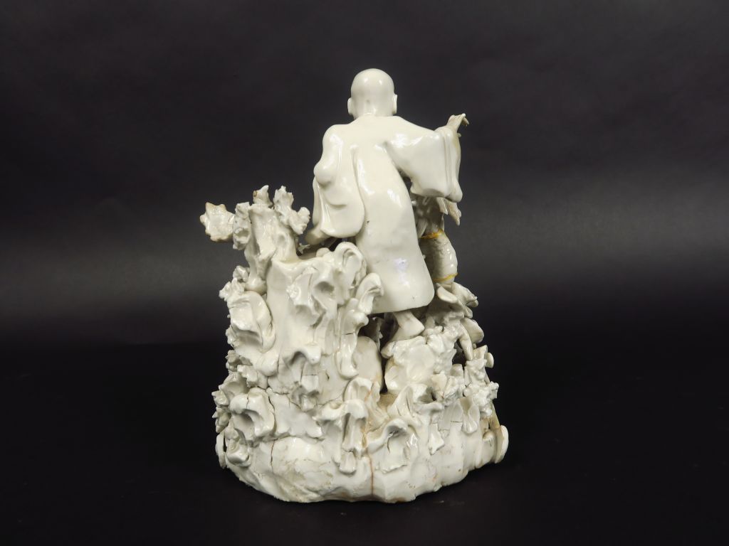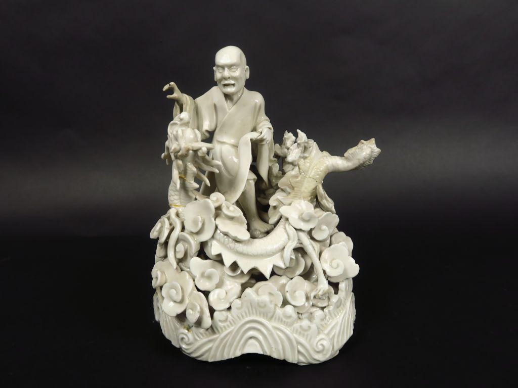 Groupe en porcelaine blanc-de-Chine représentant un sage apprivoisant un dragon émergeant des nuages. On y joint un lion formant porte-baguettes à encens. Chine, XIXème siècle. H. 22,5 cm et 22 cm. (Restauration au sage)