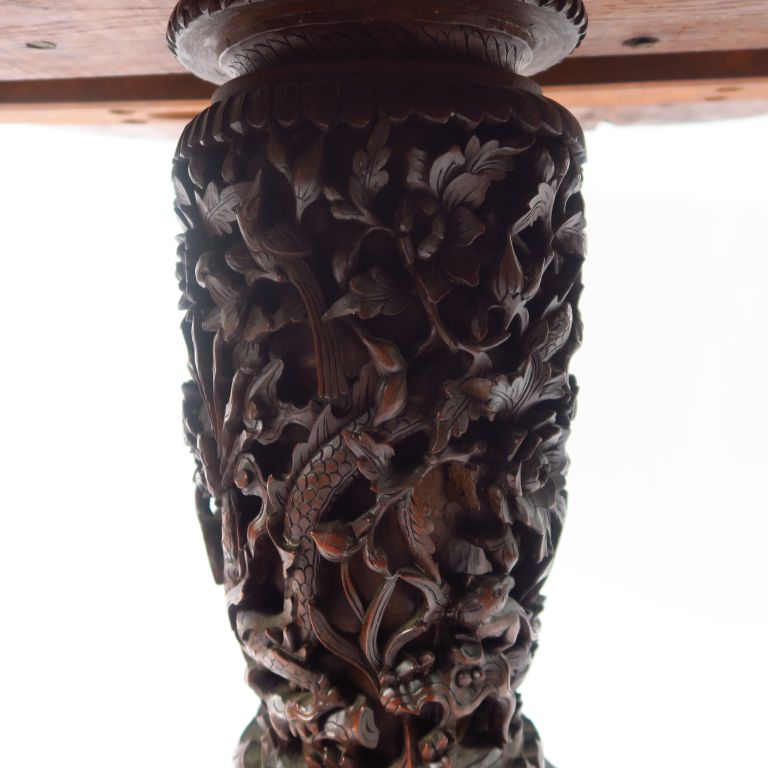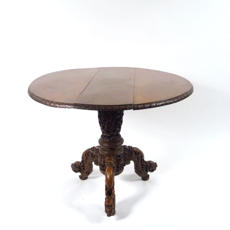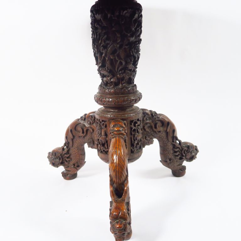 Guéridon tripode en bois de fer, à décor sculpté de dragons et de feuillage. Indochine, vers 1900. Diam. 97 cm H. 74 cm
