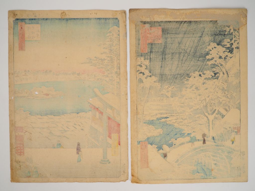 HIROSHIGE (1797-1858) Deux estampes oban tate-e de la série des « Cent vues célèbres de Edo », Meisho Edo Hyakkei. Editeur : Uoya Eikichi. - Point de vue du sanctuaire de Yushima Tenjin (Yushima Tenjin Sakaue Tenbô) (Salissures, petites taches, petits trous dans les marges) - Pont du tambour à Meguro et la colline du Couchant (Meguro Taikobashi yûhinooka) (Salissures, angle inférieur droit fragilisé)