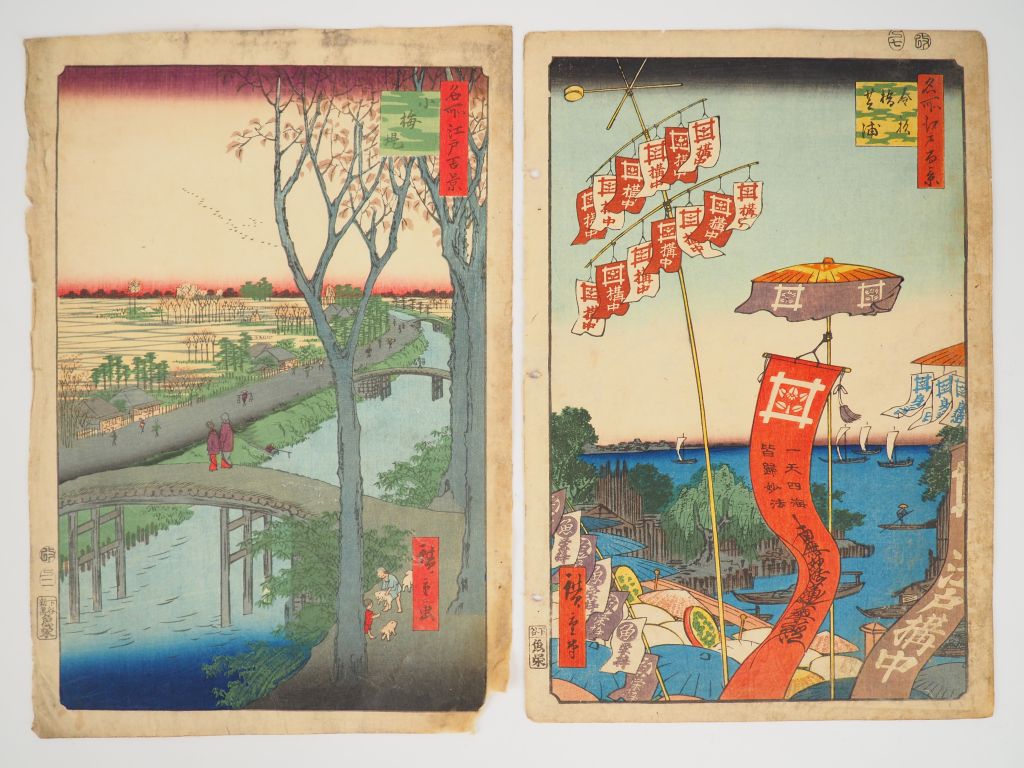 HIROSHIGE (1797-1858) Deux estampes oban tate-e de la série des « Cent vues célèbres de Edo », Meisho Edo Hyakkei. Editeur : Uoya Eikichi, vers 1856-1858 - La digue à Kume (Kumezutsumi) (Salissures, angle inférieur droit manquant, bord gauche accidenté) - Pont Kanasugi et Shibaura (Kanasubibashi shibaura) Salissures, feuille doublée et petits trous de montage dans la marge