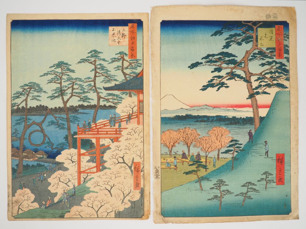 HIROSHIGE (1797-1858) Deux estampes oban tate-e de la série des « Cent vues célèbres de Edo », Meisho Edo Hyakkei. Editeur : Uoya Eikichi. - Pavillon Kiyomizu et l’étang de Shinobazu à Ueno (Ueno Kiyomizudô Shinobazu no ike) Cachet de collection Murakami (Marges rognées, doublée, salissures, angle inférieur droit fragilisé) - Fuji original à Meguro (Meguro Moto-Fuji) (Salissures, petits trous, bord gauche fragilisé)